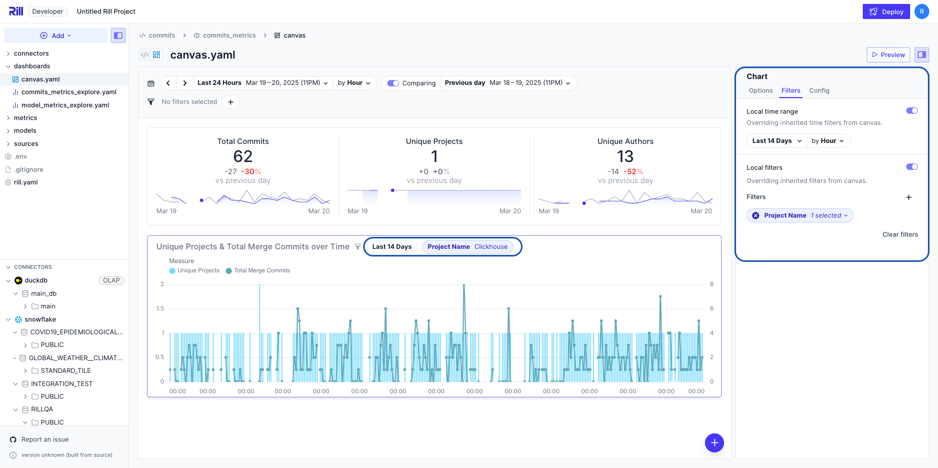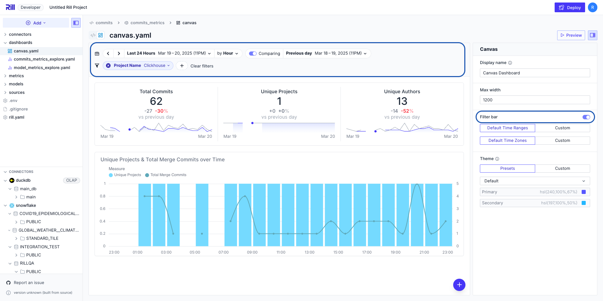 While Rill's signature Explore dashboards let you slice, dice, and interact with your data in our suggested layout, Canvas dashboards let you define your own visualizations and arrange them into your preferred layout.