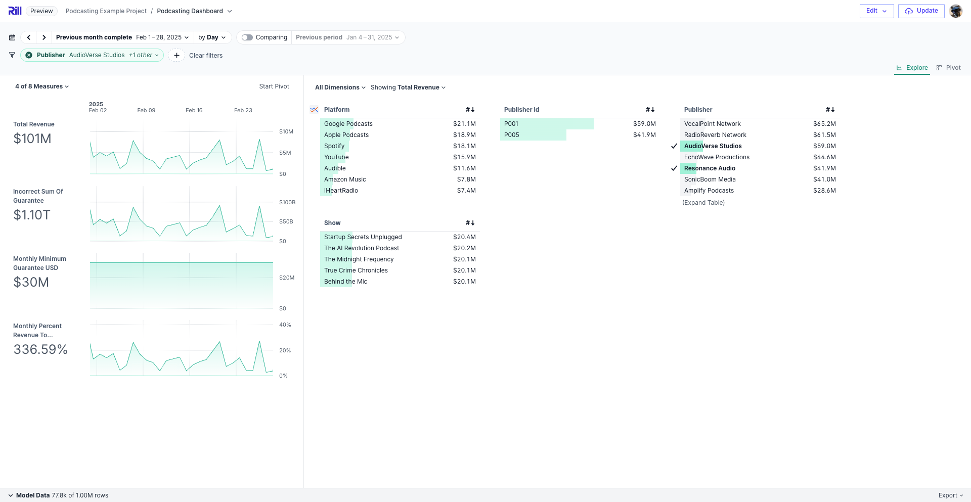 In the following example, each publishing company has a monthly minimum guarantee. As you'll see in the measure, incorrect_sum_of_guarantee, you'll get an incorrect value as this will sum multiple values as there are multiple shows and days per publisher. Another workaround would be to use MIN, MAX, or AVG, but when selecting multiple publishers, the values will not be accurate.