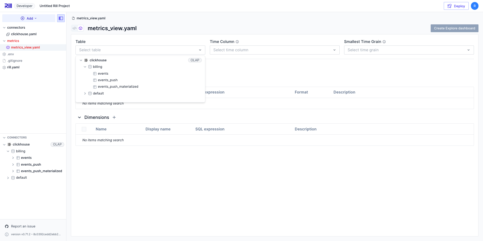 Once you have finished building your model, you can create a metrics view to define measures and dimensions for your dashboard. The way you specify the underlying data source depends on your OLAP engine.