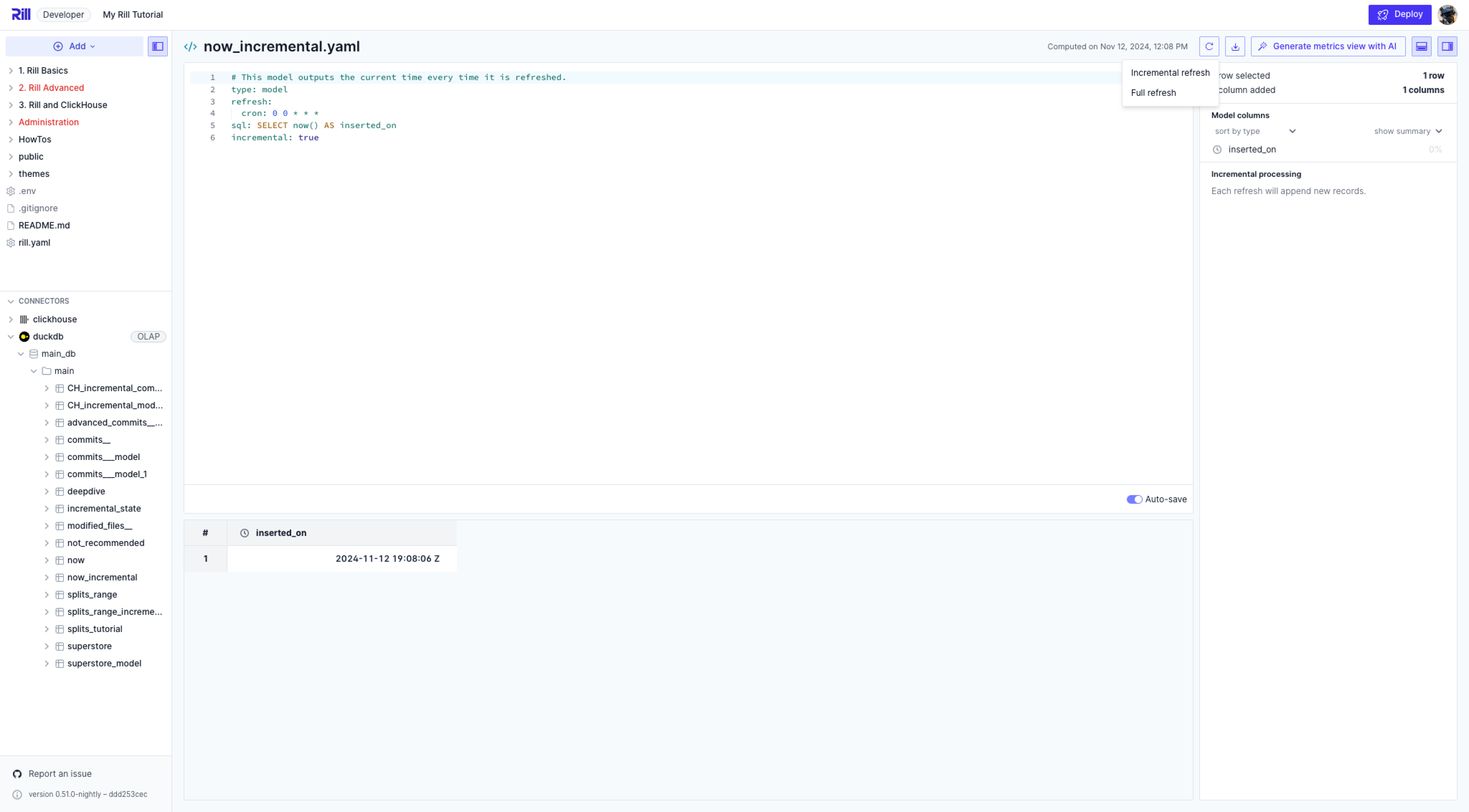 When you are testing with incremental models in Rill Developer, you will notice a change in the refresh functionality. Instead of a full refresh, you are given the option for incremental refresh.