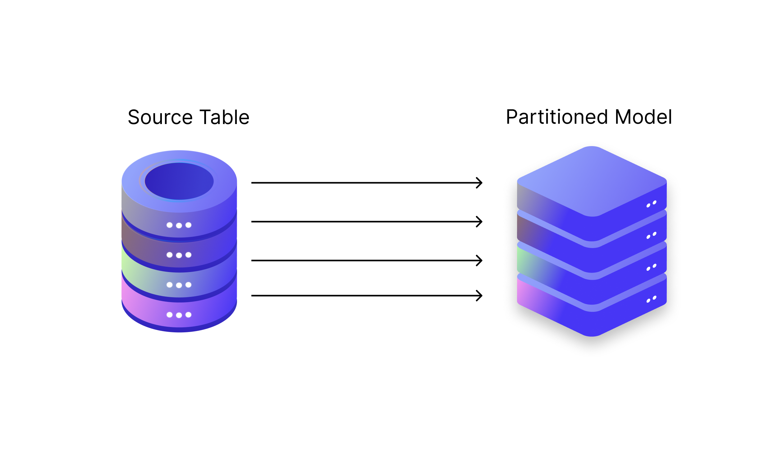 If you add an additional partition to the source table, on the next manual or automatic refresh, Rill will detect the new partition and only add the additional partition to the model, as you can see in the diagram, the blue additional partition is added in its own partition in the partitioned model. If the other partitions have not been modified, these will not be touched.