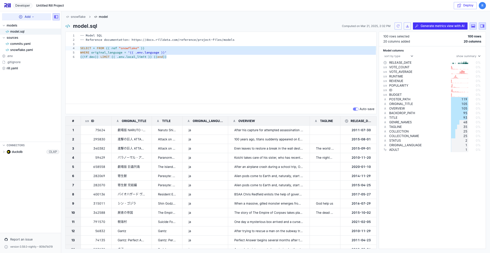Even though we have defaults set in rill.yaml (and this will be used by any downstream models and dashboards on Rill Cloud), we will instead see these local overrides come into effect with our templated logic to return Japanese movies and the model limit is now 100 rows.