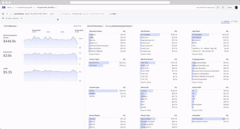 The Time Dimension Detail is a separate visualization accessed by clicking on any time series chart in Explore. Expanding the time series allows for more surface area to compare a larger number of dimensions trended over time. Additionally, you can create rapid pivot tables based on time across any dimension.