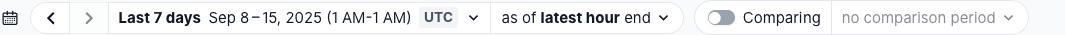 Along with setting time ranges, you have the ability to set a comparison period in the "Comparing" section of the time pill. This allows you to analyze trends and changes by comparing your current time period against a previous period.